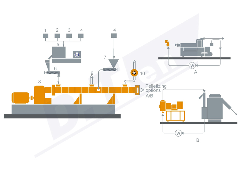 1. 聚合物 2. 彈性體(SBS、SEBS、EPDM等) 3. 軟化劑(油) 4. 填充 5. 高速混合機 6. 體積式喂料機 7. 側(cè)向喂料機(可選) 8. 雙螺桿擠出機 9. 自然排氣 10. 強制真空排氣 切粒方式: A. 水環(huán)模面切粒 B. 水下切粒 |